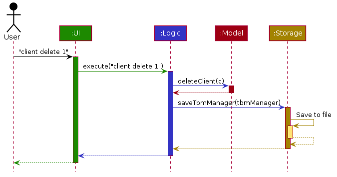 The Sequence Diagram below shows how the components interact with each other for the scenario where the user issues the command client delete 1.